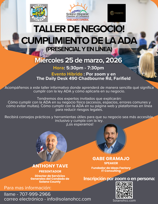 ¿Su negocio cumple con la ADA? Acompáñenos a este importante taller sobre cumplimiento físico y digital de la ADA con Anthony Tave y Gabe Gramajo. Aprenda pasos prácticos para proteger su negocio, mejorar la accesibilidad y obtenga herramientas que podrá implementar de inmediato.